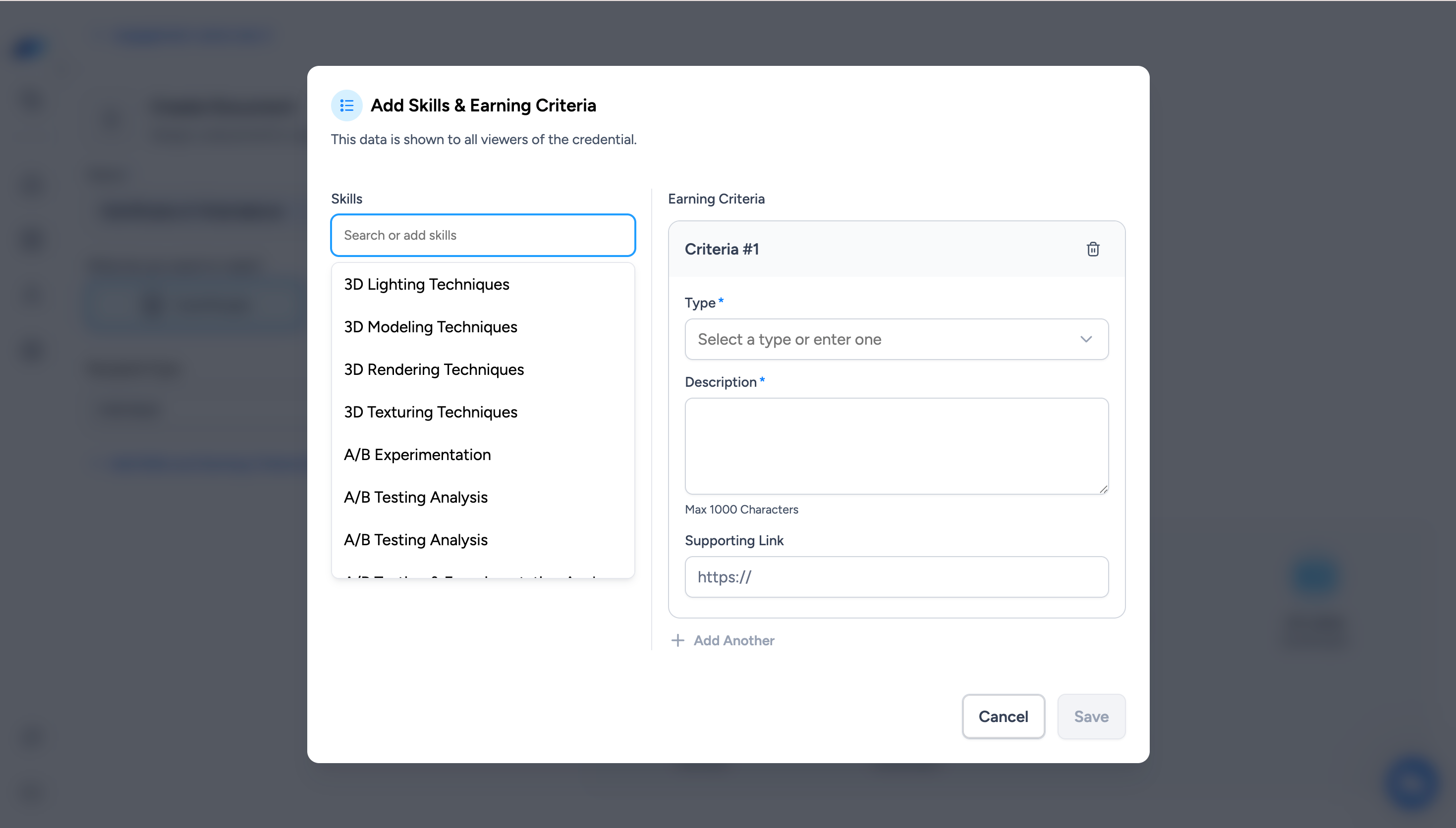 Credentials can now include Skills and Earning Criteria, helping issuers show not just that someone earned a credential, but what that credential represents and how it was achieved. These details can be added during document creation or updated later, making it easier to keep credential information accurate, useful, and relevant over time.